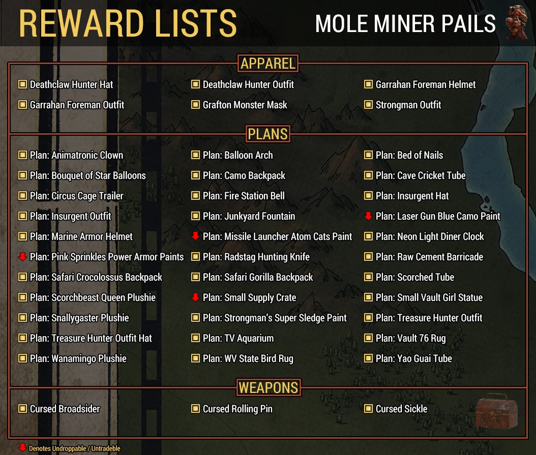 Fallout 76 Treasure Maps Rewards Treasure Map Rewards (Toxic Valley X500) : r/fo76: Season 17 has just begun in Fallout 76. It comes with a whole slew of new and exciting rewards. Also, with the new Skyline Valley update going live at the same time as season 17, players will be . Chief among these is the launch of Season 18, Country Road, which brings plenty of new rewards to earn. It also adds a new repeatable challenge that becomes accessible for all Fallout 76 players .