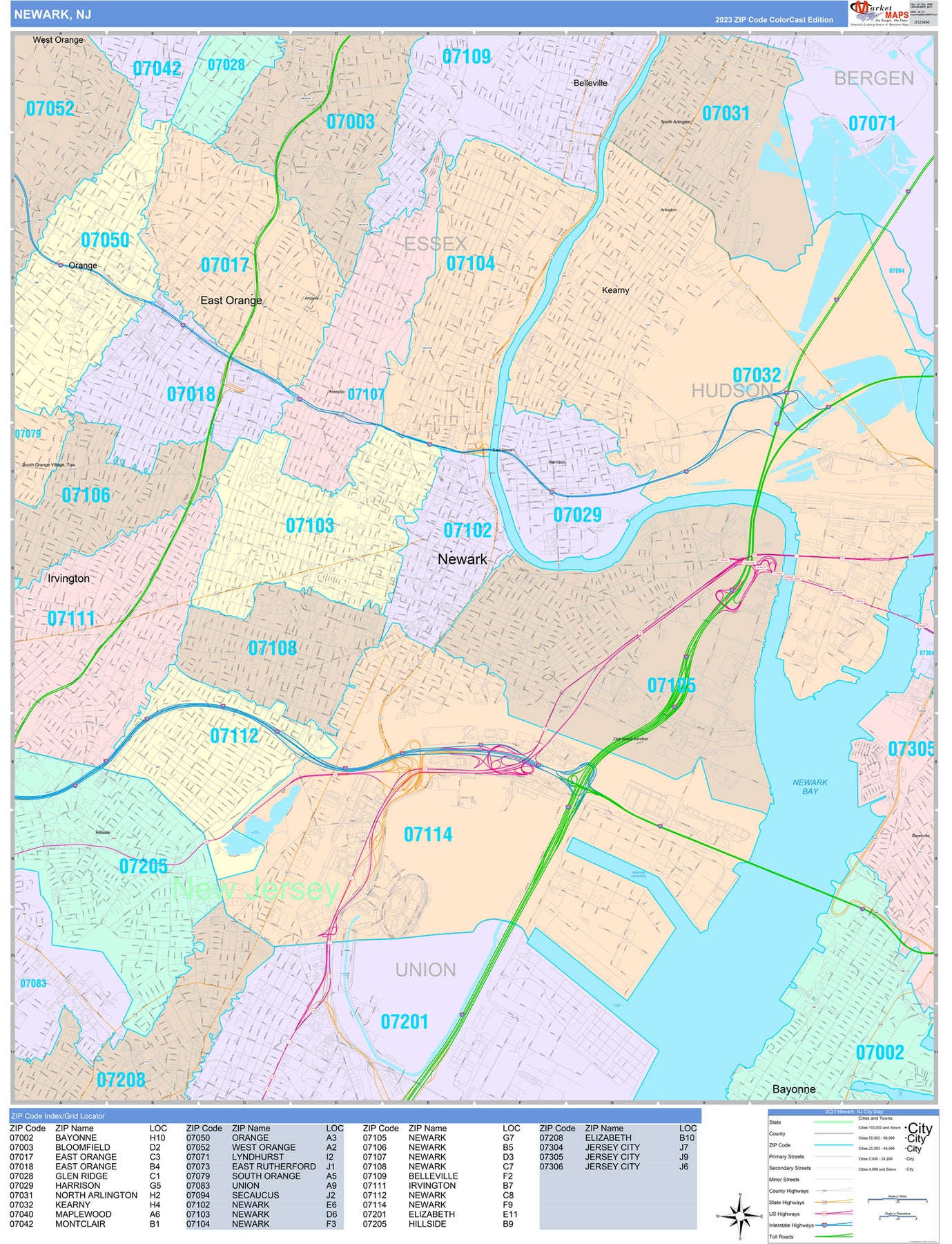 Colorcast Zip Code Style Wall Map of Newark, NJ by Market Maps